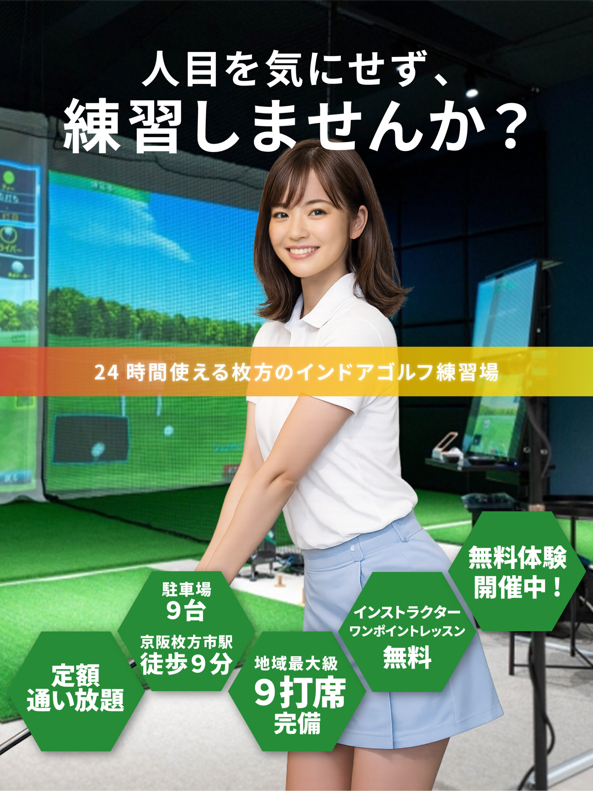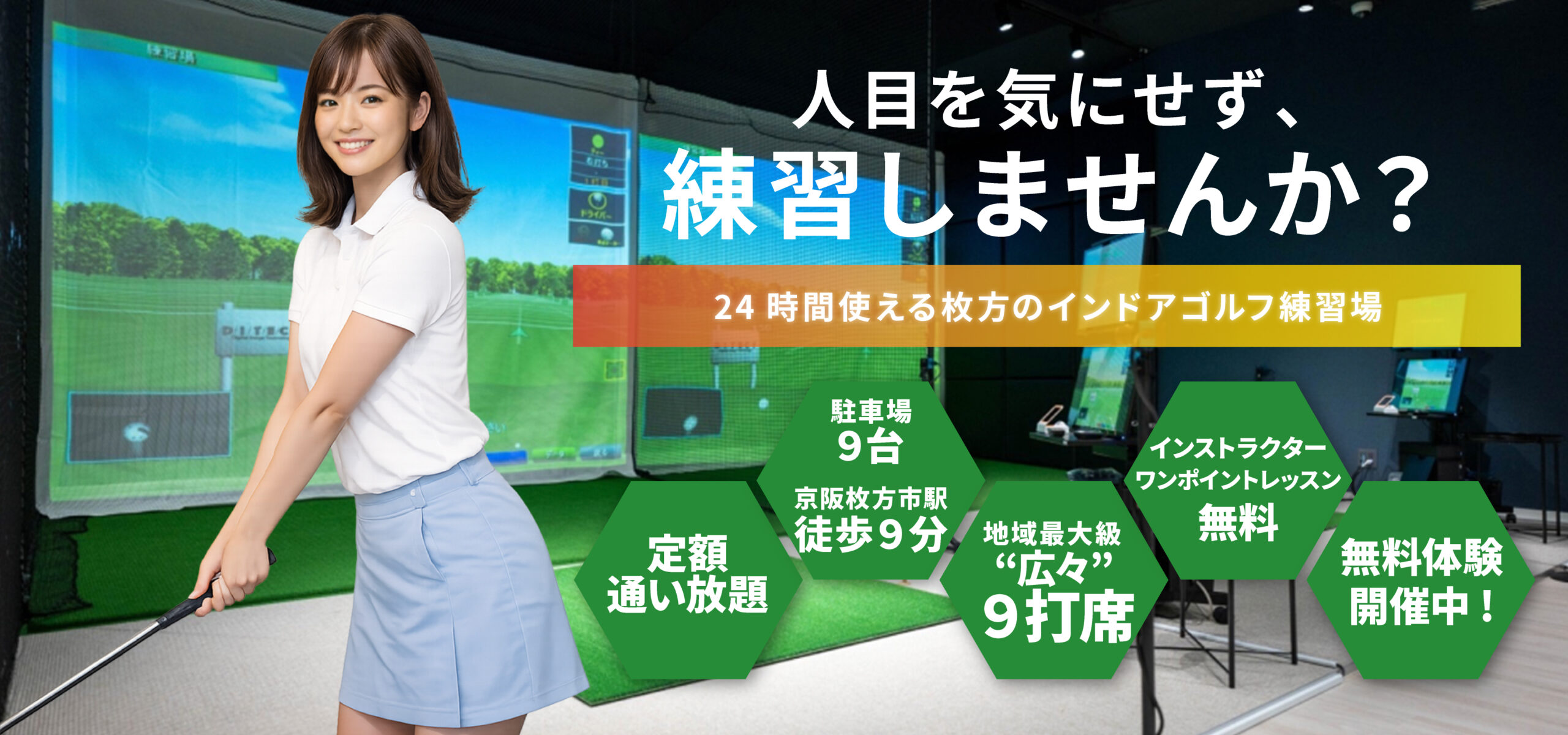 弾道測定、インパクトチェック、スイング分析で確実にあなたのゴルフスコアをアップ!1人の練習で分からないときはワンポイントレッスンでインストラクターからアドバイス!